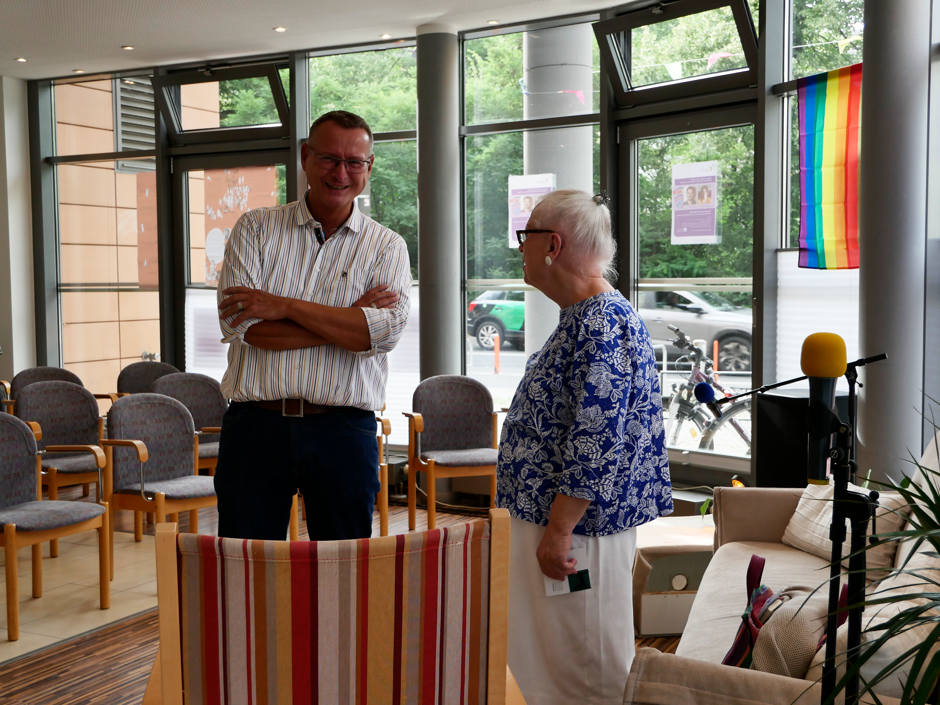 Letzte Woche lud das Immanuel Stadtteilzentrum Schöneberg zu einer Lesung und anschließendem Gespräch mit den Autor*innen Alex M. Gastel und Tugay Saraç in seine Räume ein. Zwei Stimmen – zwei Perspektiven – unter diesem Titel fand ein Abend der Vielfalt, Offenheit und gegenseitigen Bestärkung anlässlich des Pride Month statt. Das Team des Stadtteilzentrums organisierte die Veranstaltung in Kooperation mit dem Immanuel Seniorenzentrum Schöneberg und Ralf Schäfer, dem Beauftragten der Immanuel Albertinen Diakonie für Diversität und queere Lebensweisen in der Sparte Wohnen & Pflegen. In seiner Anmoderation bezeichnete Schäfer Lesungen wie diese als einen Akt der Selbstbehauptung. Queere Kultur ist für ihn nicht Beiwerk, sondern überlebensnotwendig. Als Co-Moderatorin des Abends konnte die Publizistin Nora Eckert vom Zentrum TransInterQueer e.V. gewonnen werden.