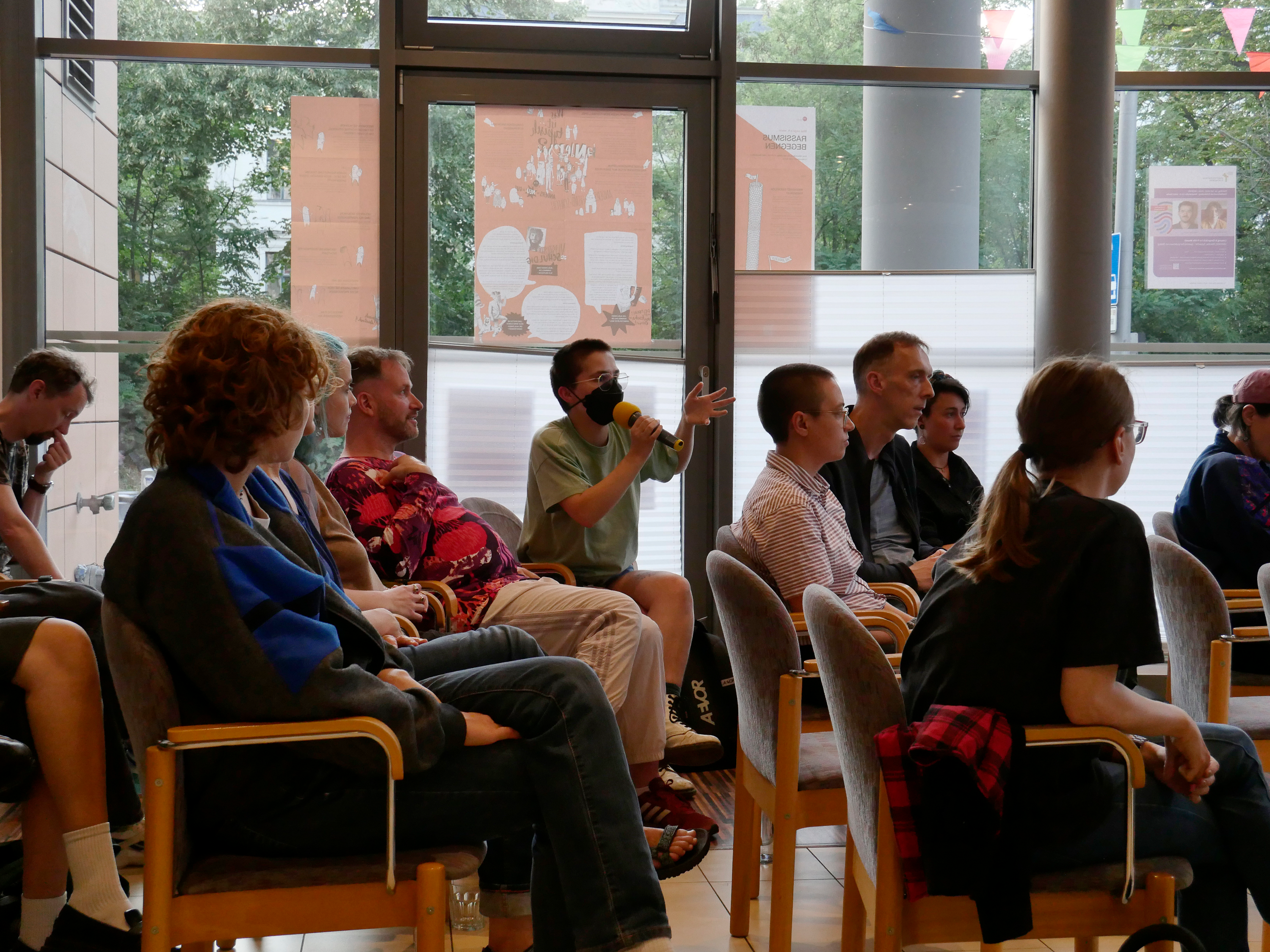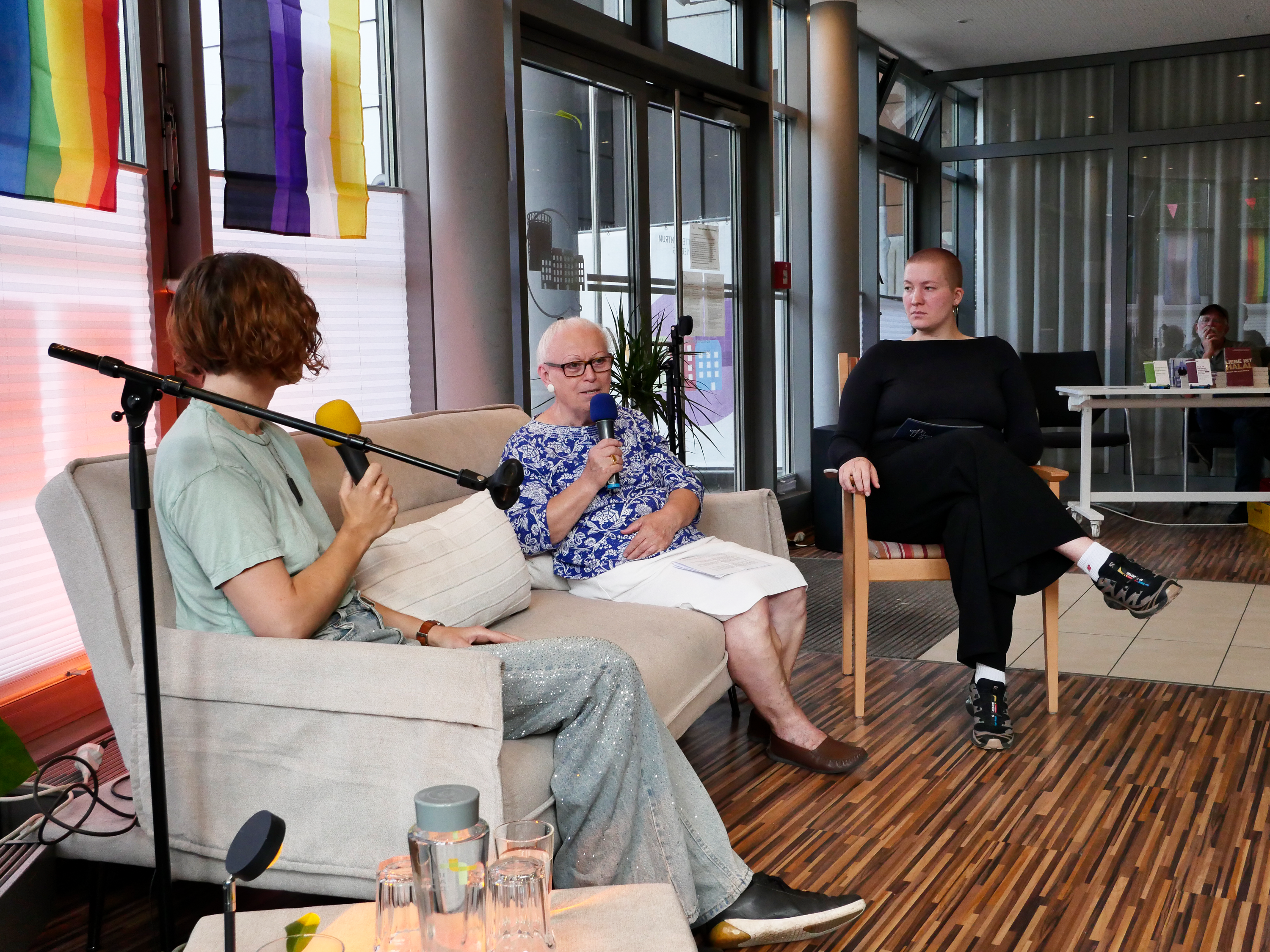 Nora Eckert und die Gäste stellten den Autor*innen anschließend zahlreiche Fragen zu ihren persönlichen Erfahrungen als queere Menschen, ihrem Aktivismus, zum Umgang mit Ausgrenzung und mit Versuchen, sie zum Schweigen zu bringen. Dabei ging es auch um eine Einschätzung der aktuellen politischen Situation sowie ihre Erwartungen und Wünsche an die Politik wie auch an die Gesellschaft. Als ganz wichtiges Element in der Unterstützung queerer Communities wurde die Solidarisierung und das Aktivwerden nicht-queerer Menschen genannt. In dieser Hinsicht, so Nora Eckert, war etwa der CSD in Budapest ein hoffnungsvolles Zeichen. Bei anschließenden Get together mit Getränken und Snacks hatten die Gäste des Abends weiter Gelegenheit zu Kennenlernen, Austausch und Begegnung.